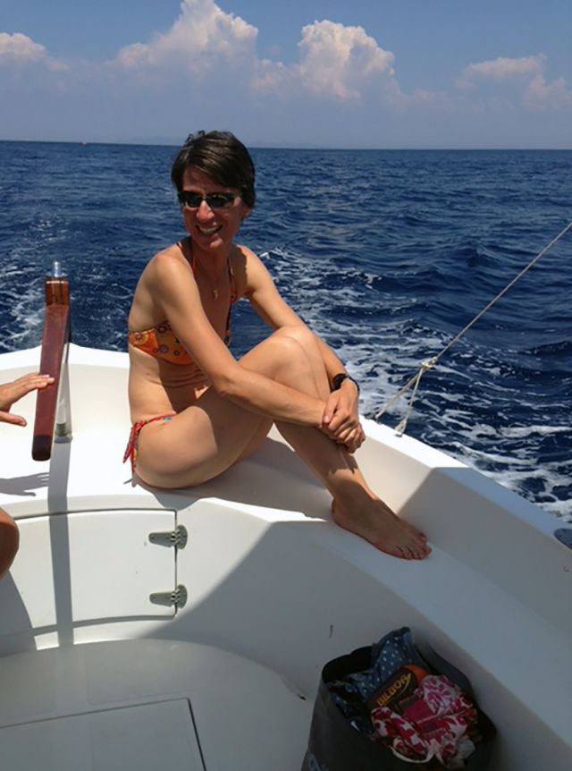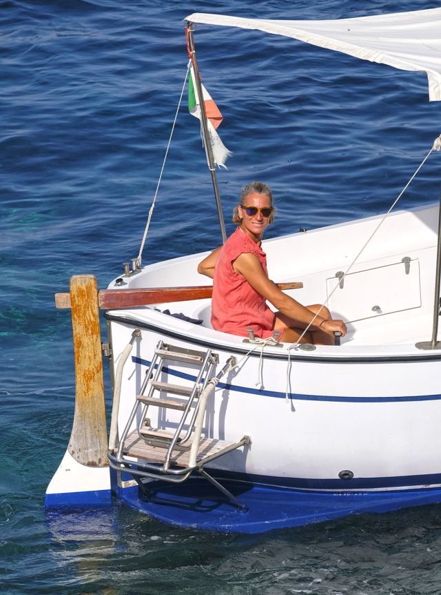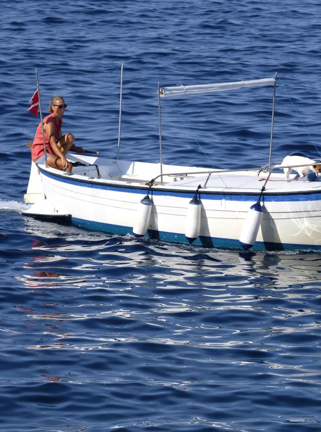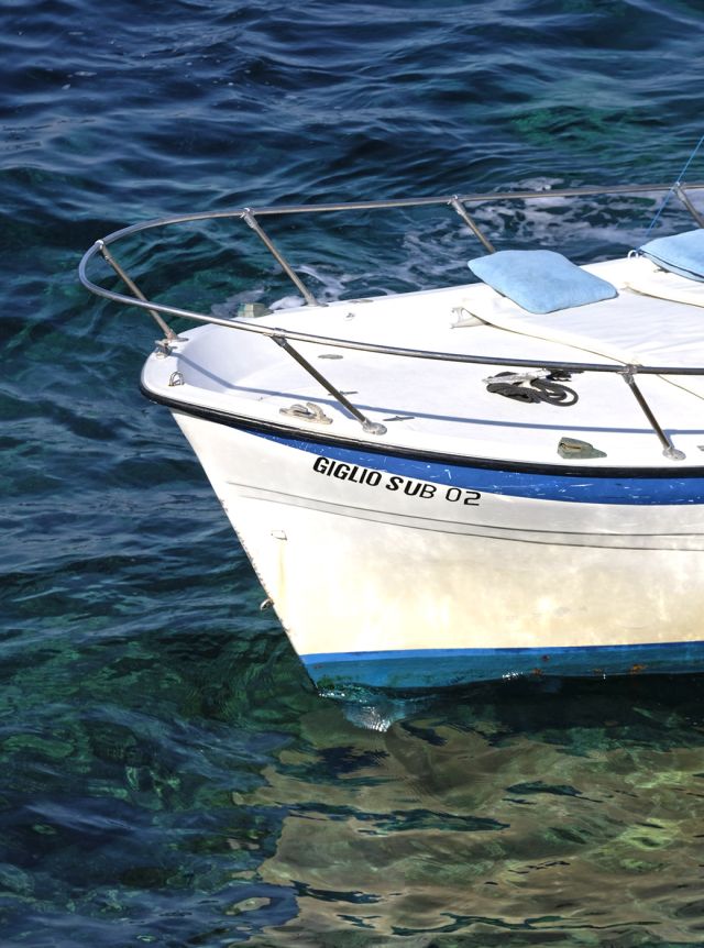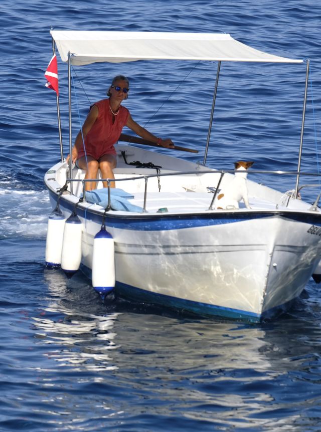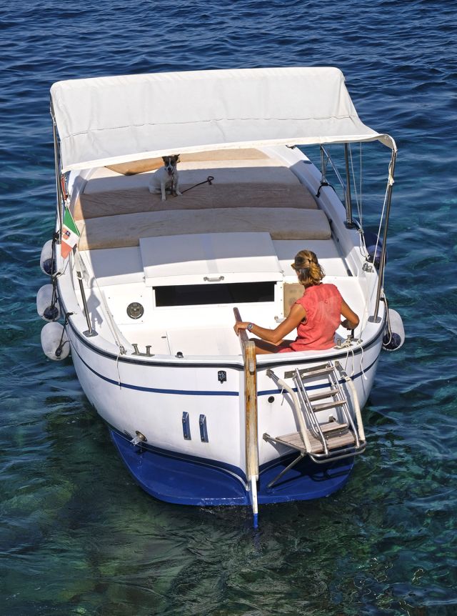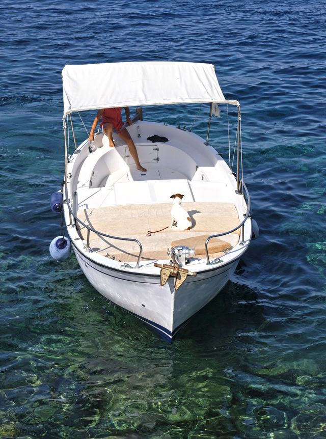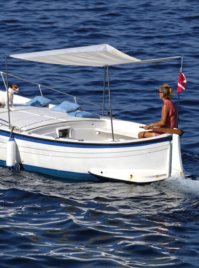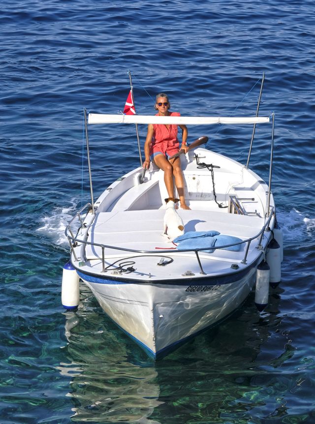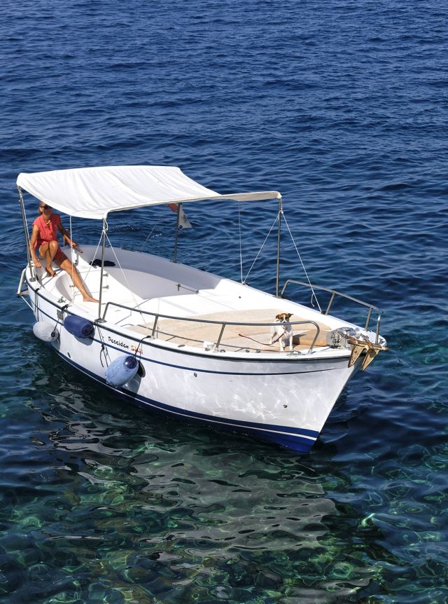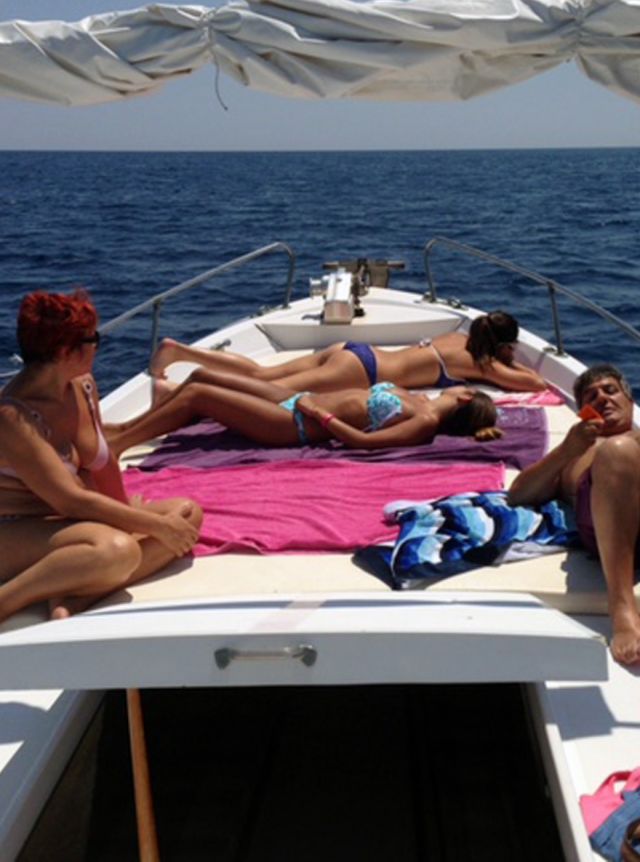 Gozzo in vetroresina con cuccetta sottocoperta a 2 posti letto per riposare durante le ore più calde, lunghezza 7,50mt e portata massima 8 persone.